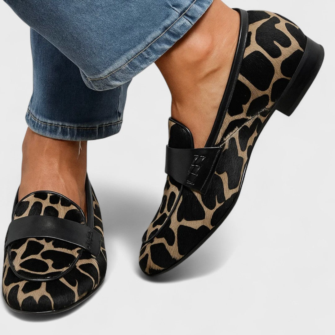 Egyedi dizájn - Az élénk állatmintázat és a fekete bőr kontrasztos részletei eredeti megjelenést kölcsönöznek ezeknek a cipőknek, tele személyiséggel