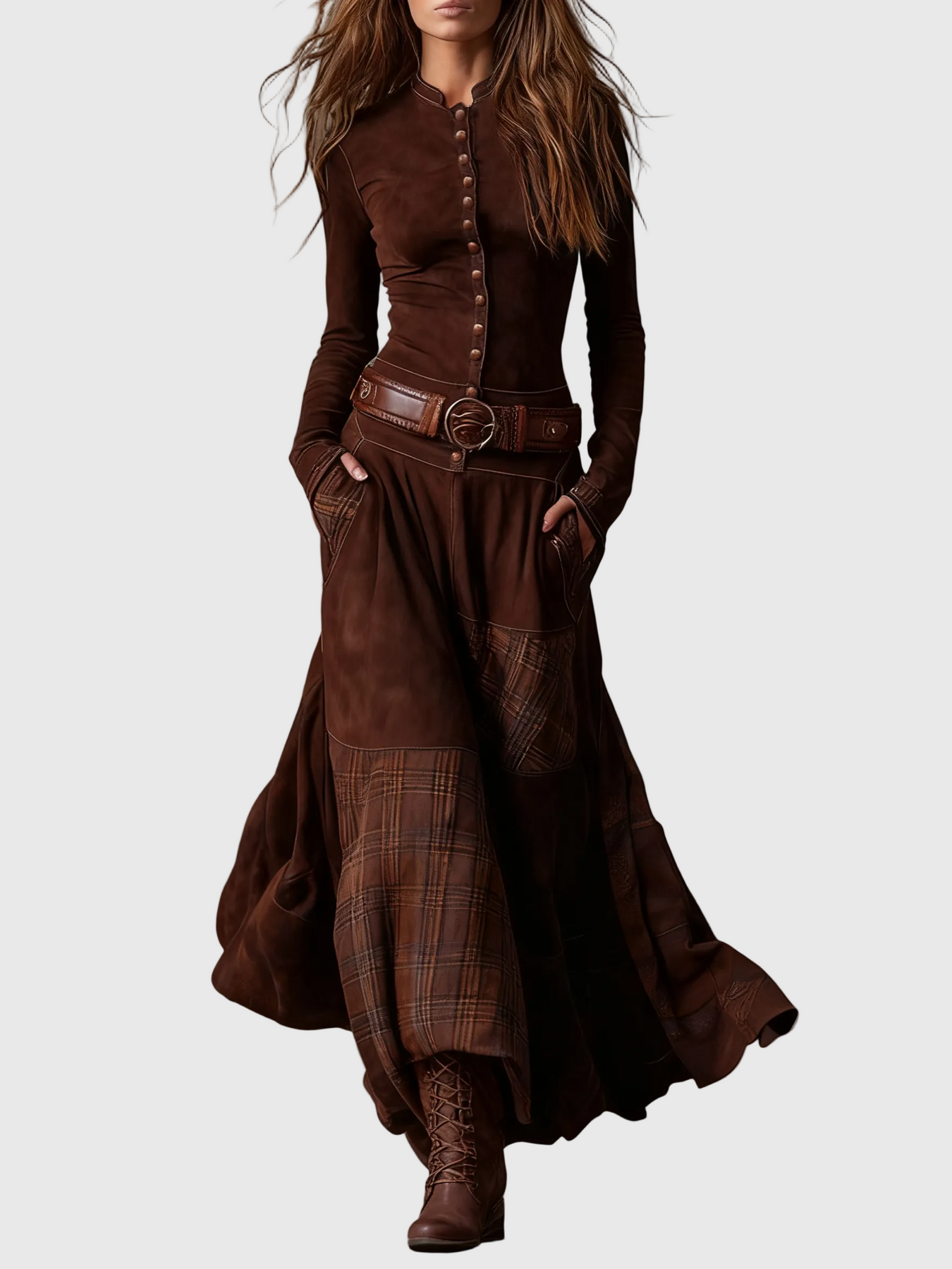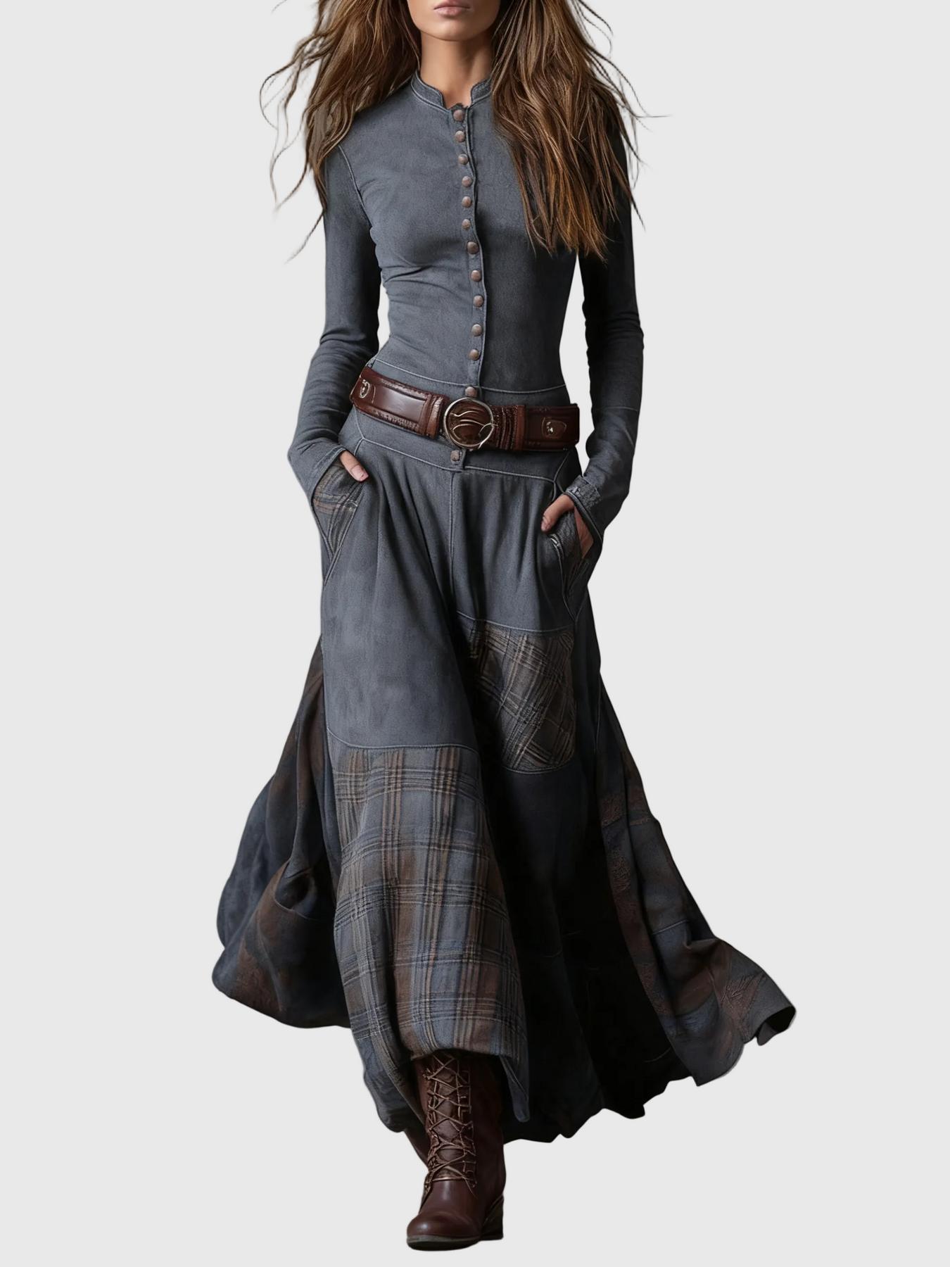 A testhez simuló felső fém gombokkal kiemeli a sziluettet, míg a folyékony szoknya patchwork részletei dinamizmust és bájt adnak minden lépésnél. Egy ruha, amelyet szabad lélekű nőknek terveztek, akik értékelik a megkülönböztetést.
