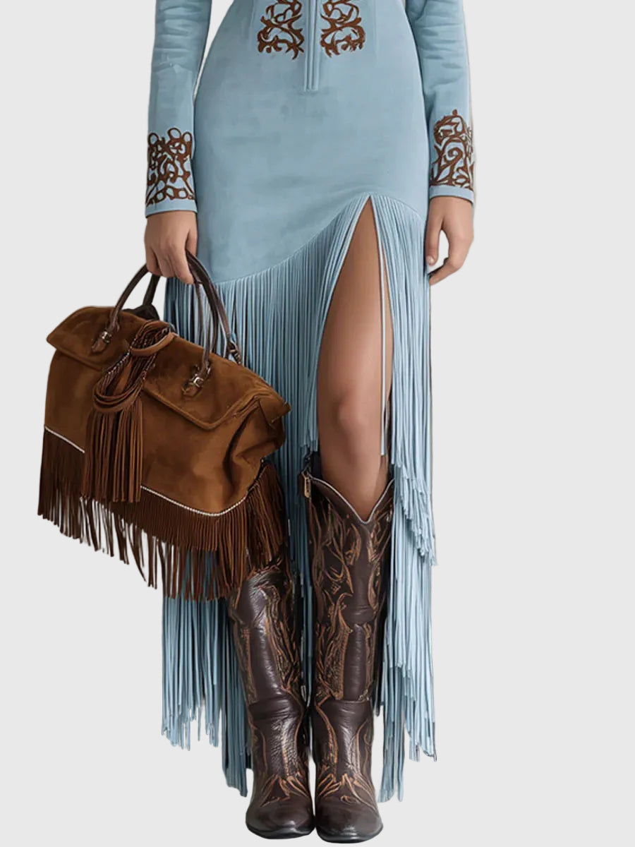 Boho Elegancia Hímzett Műsuede Fringes Maxi Ruha