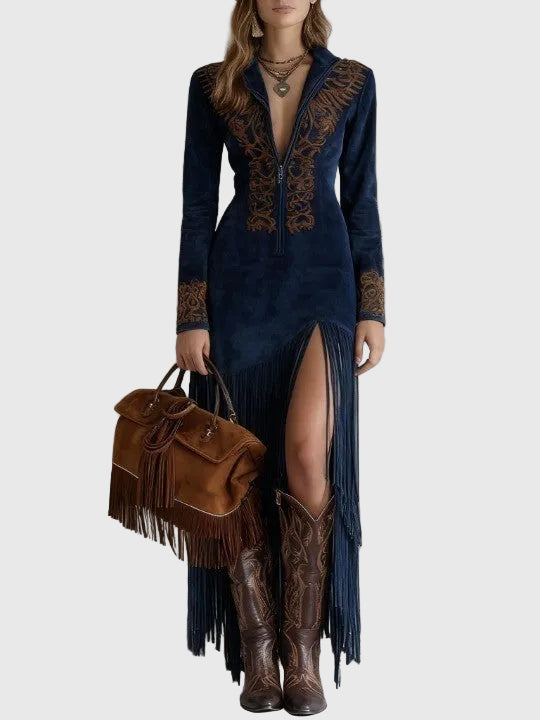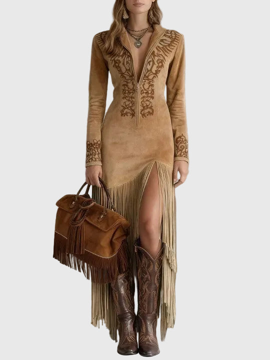 Ez a lenyűgöző, nyugati ihletésű maxi ruha a bohémiás stílust ötvözi egy kis vintage hangulattal. A fél-zippes dizájn és a nyakvonal mentén található bonyolult hímzés egy jellegzetes, elegáns érintést ad, míg a szegélyen lévő frufru részletek szórakoztató, szabad szellemű hangulatot kölcsönöznek. Puha műsuede anyagból készült, ez a ruha tökéletes a merész megjelenéshez fesztiválokon, laza összejöveteleken vagy estélyeken.