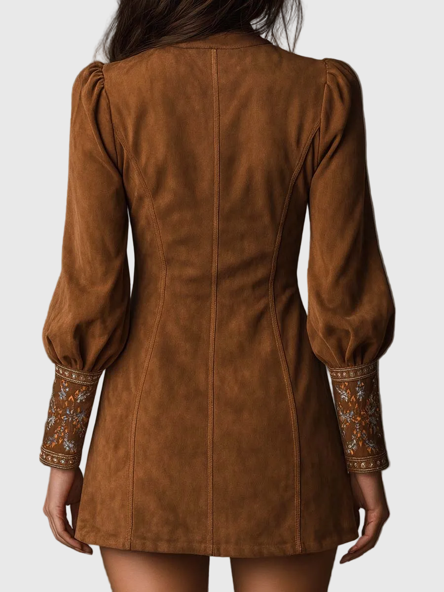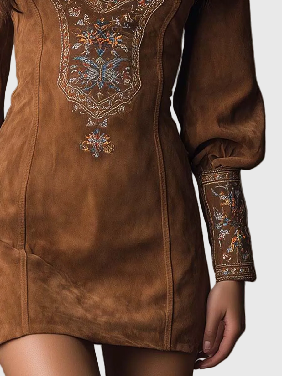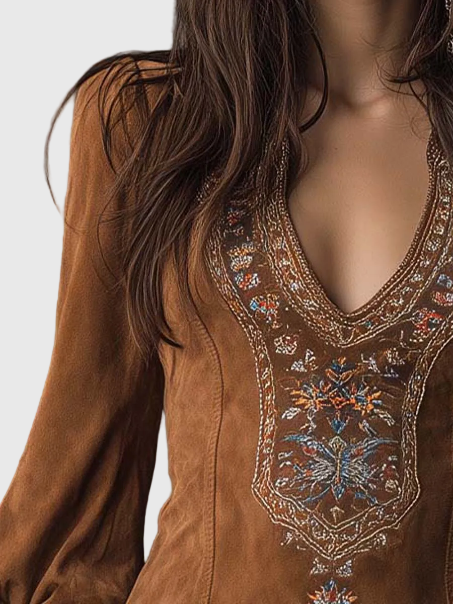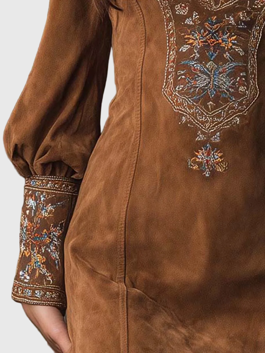 Kifinomult virágos hímzés – díszítő minták a nyakon és a mandzsettákon, amelyek vintage ihletésű kézműves bájt adnak.