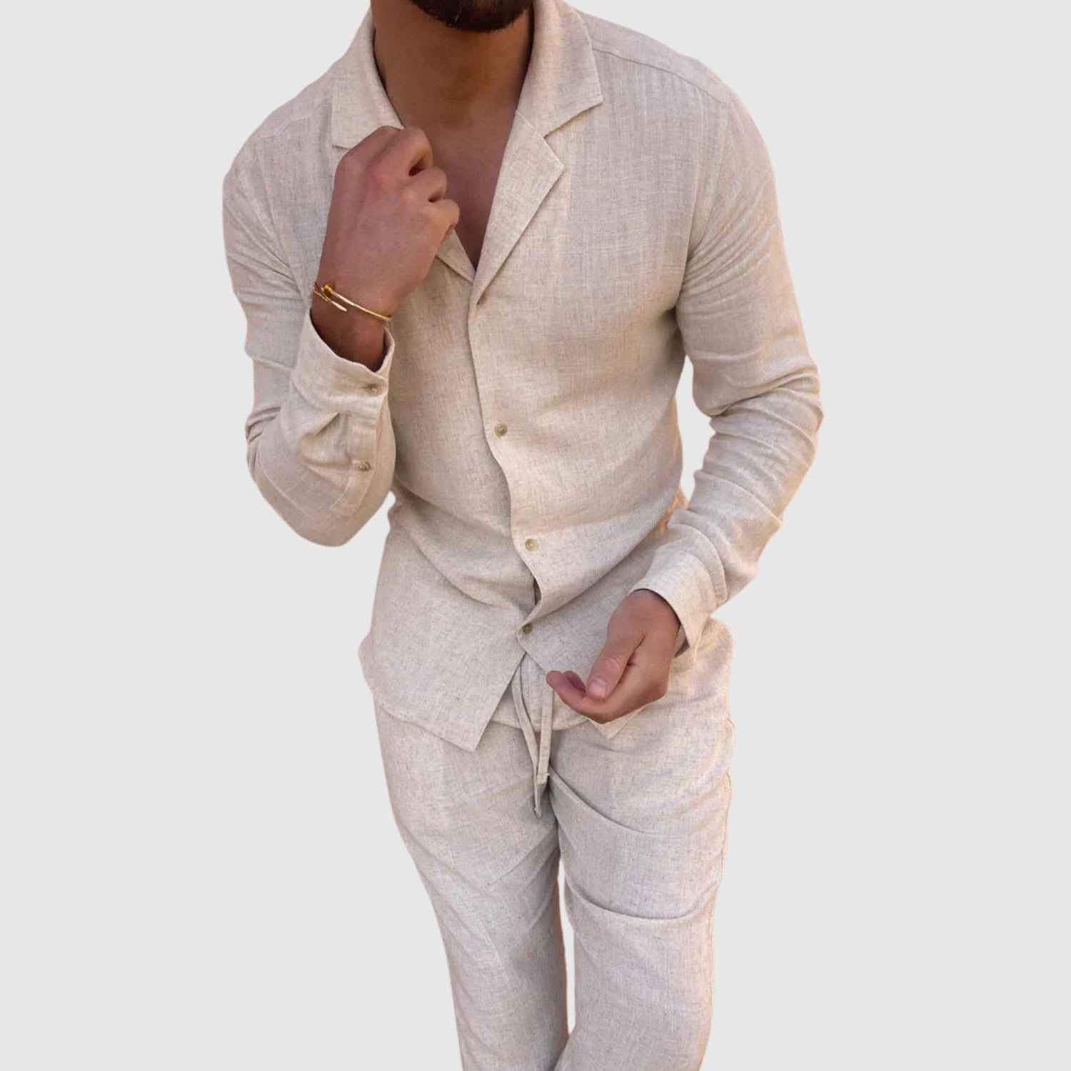 Ez a vászon szett tökéletes kombinációja a kényelemnek és a stílusnak. Könnyű és lélegző anyaga egész nap kényelmesen tart, míg kifinomult dizájnja lehetővé teszi, hogy minden alkalommal tökéletesen nézzen ki, a hétköznapi találkozóktól a különleges eseményekig.
