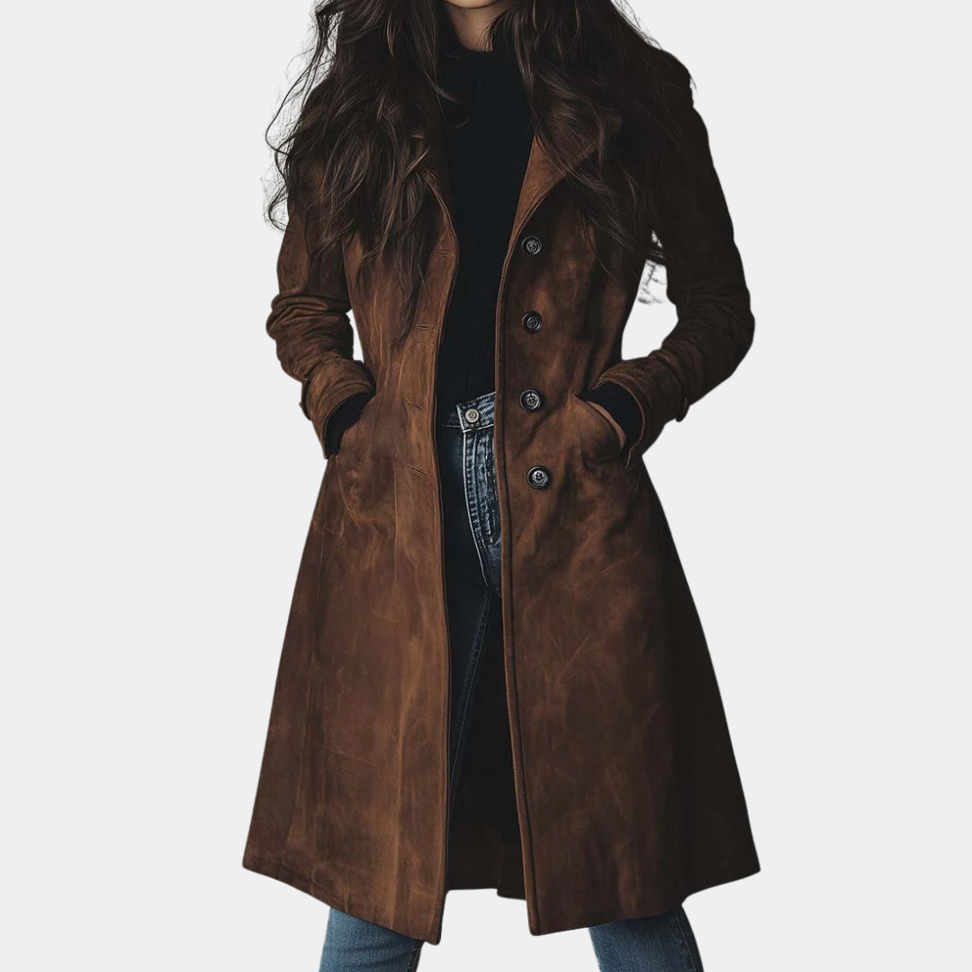 Időtlen Dizájn: Egy klasszikus trench sziluett újraértelmezve gazdag suede anyagban, a kifinomult, tartós megjelenésért.