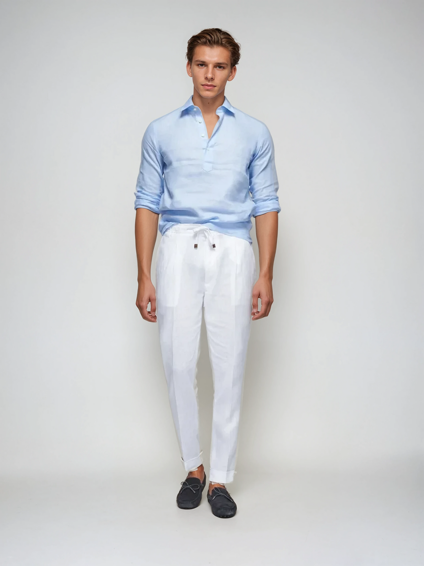 A Linen Pop-over Ing – Világoskék ideális formális és informális alkalmakra. Viselje len nadrággal nyári megjelenésért, vagy kombinálja chinoszal elegáns smart-casual stílusért.