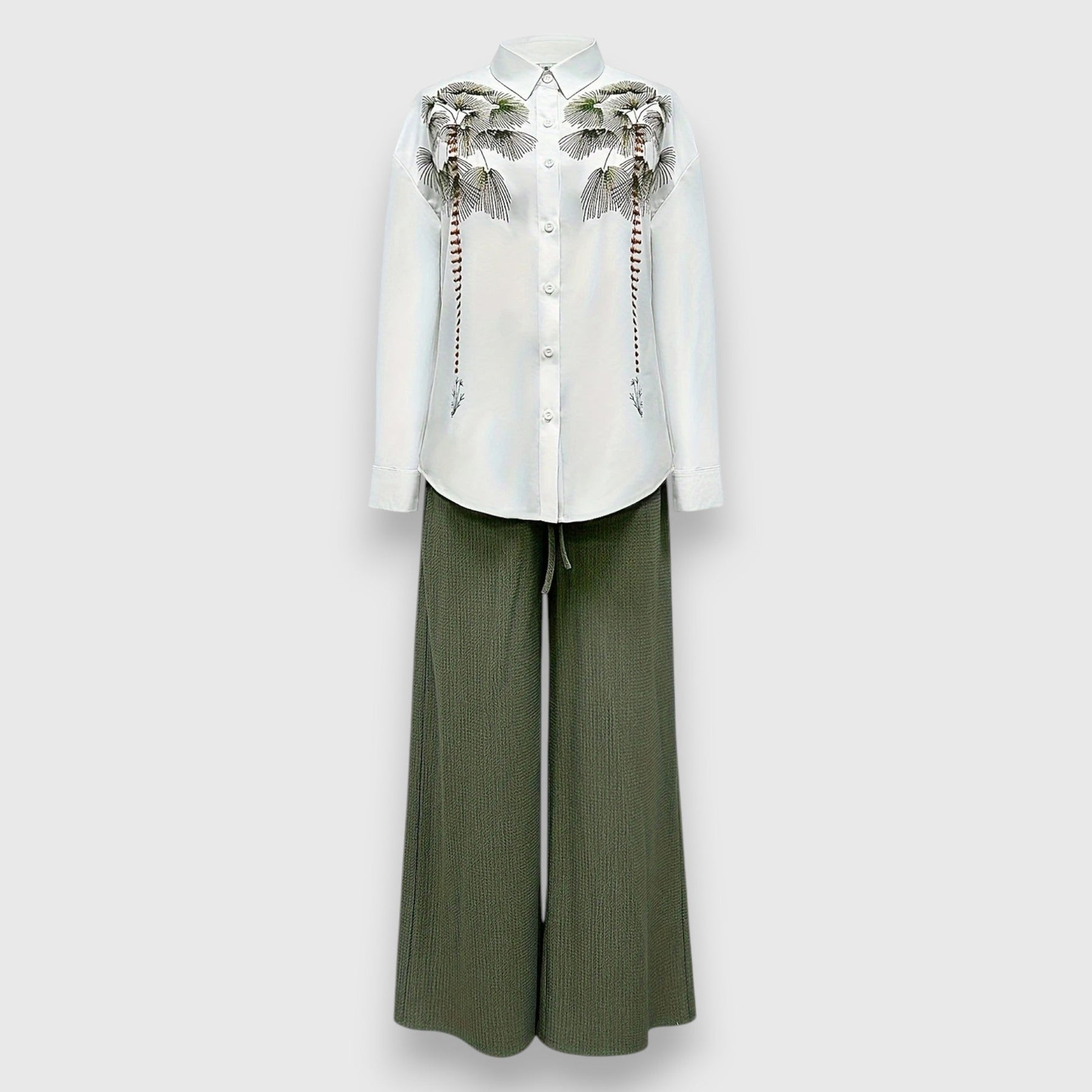 A Nivana szett elegáns blúzt kombinál finom virágmintákkal és laza, széles szárú nadrágokkal – ideális stílusos napokra. A könnyű anyag és a magas gallér nőies és kifinomult megjelenést kölcsönöz az egésznek.